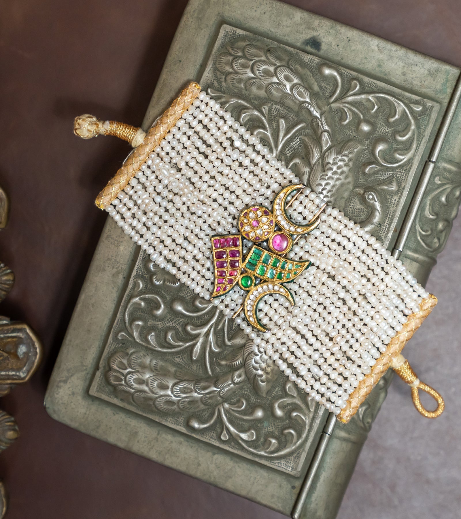 • Crafted in gold and adorned with natural Polki diamonds, genuine gemstones, and authentic pearls.
